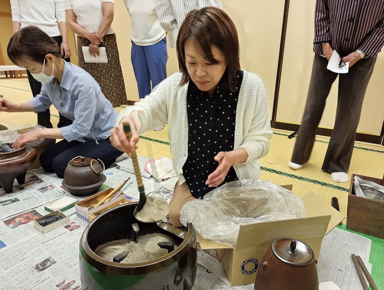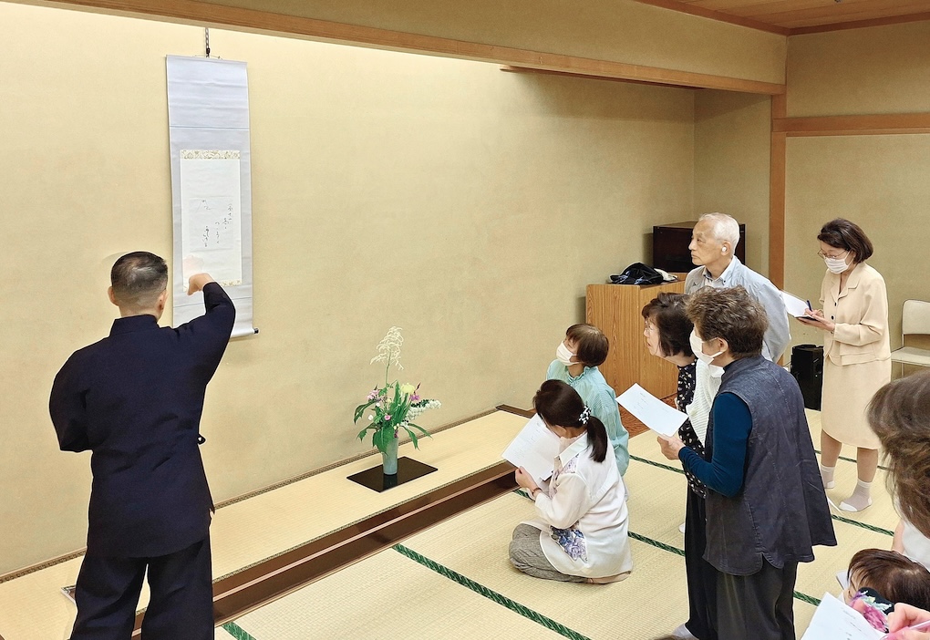 名心宗匠をお迎えし、「体操」、「小習・風炉の灰」をテーマに研究会が開催されました。まず、宗匠がご持参された、詩人・フランス文学者である堀口大学先生の掛け軸を鑑賞させていただきました。「富士山 髙く つつましく」の書からなるお軸に、改めてお稽古の心のありようを考えることができました。続く小習では、二種類の風炉にそれぞれ遠山と丸灰押切りの灰型を皆様で作成しました。宗匠からは、灰の量や丁度良い火袋など細かなご指導をいただきましたが、特に、「客人を想い、本気で取り組むこと」という言葉が心に残りました。
