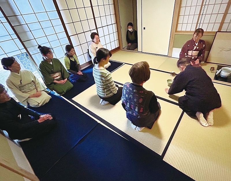 今回は花と掛軸について宗匠のお話を聞きながら一つずつの動きを目で確かめることができ、とても勉強になりました。体操は着物姿でできる立居の体操を教えていただきました。動きは少ないのですが基本の基本である深い呼吸と正しい姿勢を保ちながら、ゆっくりと動くというのはとても難しいと感じました。長年の習慣で浅い呼吸と前屈み、そり腰と悪い癖が身体にしみついてしまっています。正しい呼吸、正しい姿勢に戻るのはなかなか難しいですが、まずはお茶室の中から心掛けていきたいと思いました。休憩をはさみ、後半は四畳半での「札なし花月」と「炭付き花月」に取り組みました。「炭付き花月」では炭点前全くの初心者の私にまさかの札が当たりました。先生や社中の皆様がハラハラと見守る中、戸惑って手が止まってしまう私に一つ一つ丁寧にご指導いただき、何とか最後まで終えることが出来ました。