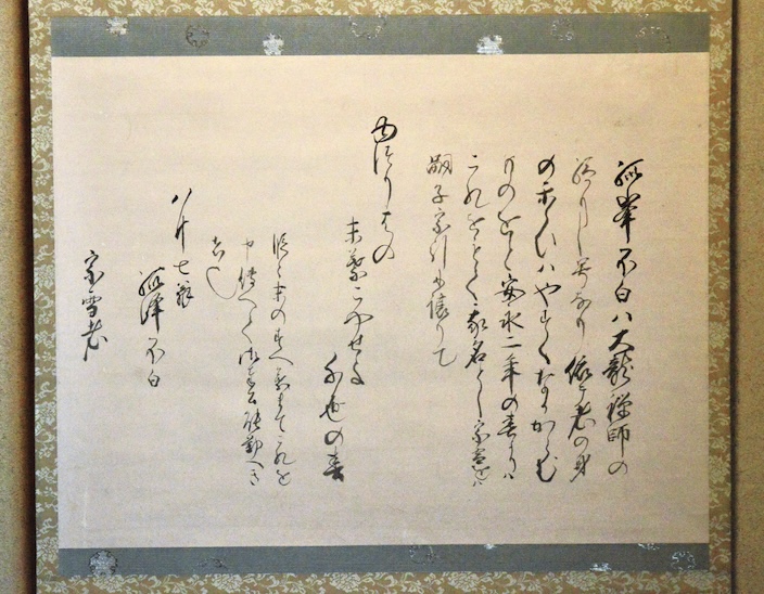 ■一円庵 床 不白筆 ゆずり葉の文 自得斎宛 香合 不白在判 金獅子 三宝に炭飾り ■ 教 場 床 朝日 松林桂月筆 花 松 千両 葉牡丹 花入 信楽大壷 室町時代 岩松図屏風 十七世紀 脇床 盆栽 白梅 ■蓮華庵 床 光悦筆 消息 正月の茶 花 水仙 白梅 花入 青竹 生野徳三作 茶碗 不白作七福神 赤 毘沙門 黒 天女 釜 蒲団 水指 高取一重口 炉椽 嶋柿 薄茶器 木地曲六角 橋村萬象作 茶杓 紅撥鏤製 御茶 又玄 丸久小山園 御菓子 鶴と松 岬屋製