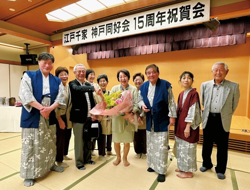 立礼席では、新宮の方々の頼もしく凛々しい袴姿でのお点前、半東、お運び、そして私達神戸とのコラボで始まりました。緊張する中、名心宗匠の〝楽しく…〟、家元の〝楽しいお茶を皆さんと…〟のお言葉を思い出し進めて参りました。あたたかく見守って下さったご列席の江戸千家の皆様、そして細やかにご指導下さった渡辺先生、共に学び支え合ってきた神戸同好会の皆さんとの心に残る記念茶会となりました。