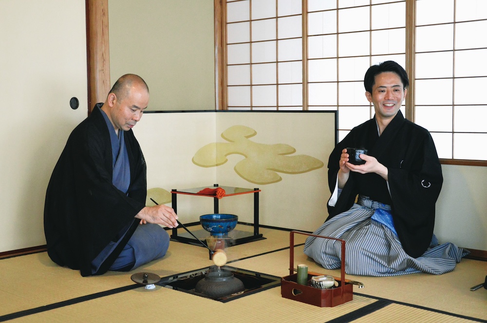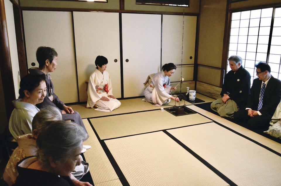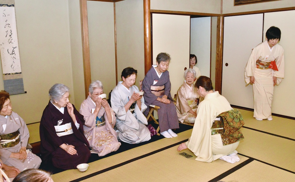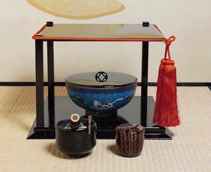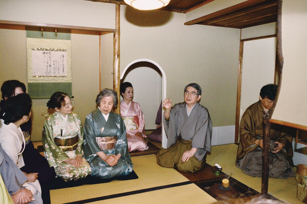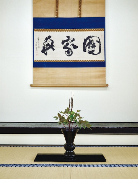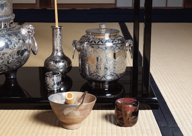 上段の間 江戸千家社中物故者に供茶 床 孤峰不白筆 国家興 花 牡丹 花入 胡銅 濃茶器 朝日春慶 薮内燕庵箱 茶碗 建盞天目 青貝台 不白箱 屏風 時代 岩松図 一双 十七世紀 真台子 風炉釜 皆具 南鐐 沢田宗味作 薄器 鶏頭棗 守屋松亭作 茶杓 真塗菊蒔絵 原羊遊斎作 茶碗 御本 御茶 星の奥 星野製茶園詰 菓子 相生しぐれ 越後屋製 器 古九谷 菊花紋大皿 数茶碗 中里重利作