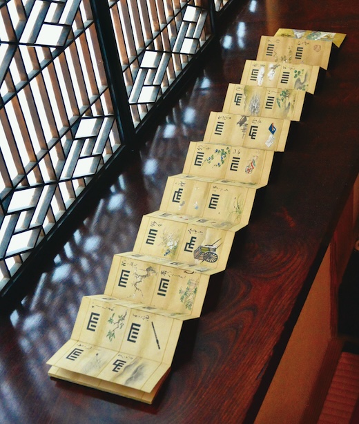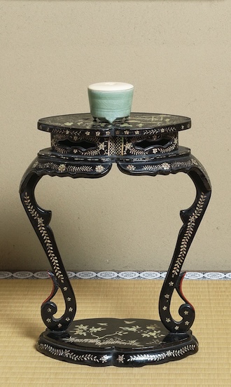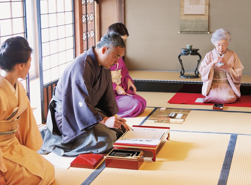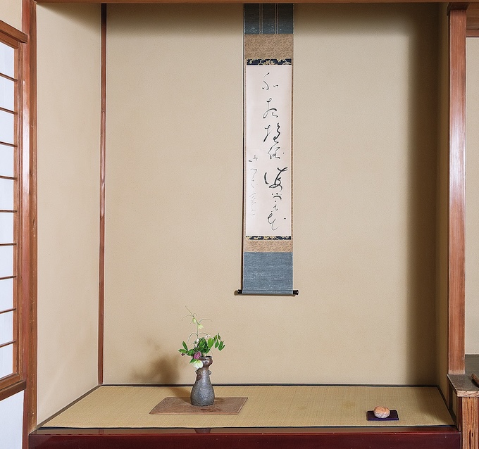 本席 床 常磐の松 源宗于書 床前 青磁香炉 伝来 明時代 唐物卓 床脇 沈香箱 香道具蒔絵 東山時代 付書院 源氏香図本 土佐光貞画 新慶賀香(志野流組香 外組の八十四番) 【香四種】 「鶴」 三包内一包試香 「亀」 右同断 「蓬莱」 右同断 「客」 一包無試 【出典】 『和漢朗詠集』「祝七七四」 「嘉辰令月歓無曲萬歳千秋楽未央」謝偃 「長生殿裏春秋富不老門前日月遅」保胤 「わかきみは千代に八千代さされ石の巌