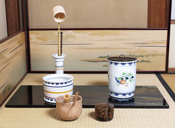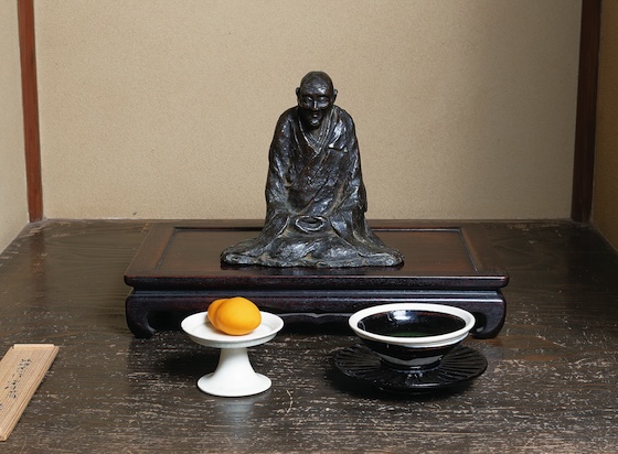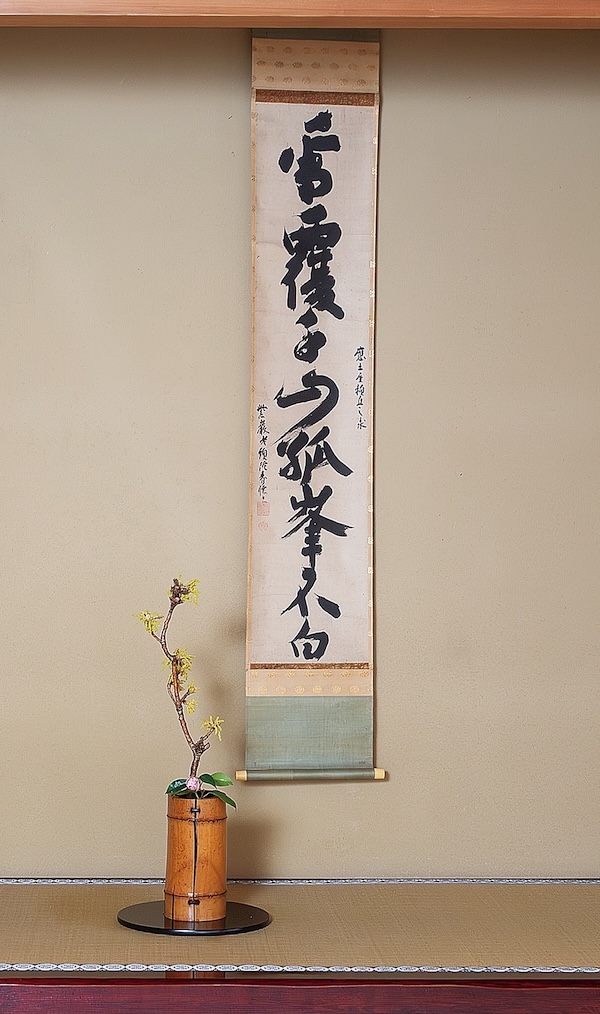 寄付 化生庵 床 孤峰不白居士 松自画讃 松樹千年緑 本席 床 玉舟宗璠 一行 雪覆千山孤峰不白 花入 一翁 竹尺八 銘霓 在判 愈好斎箱 花 春の台(椿) 黄金柏 香合 青磁 開扇 脇 古瀬戸小芋子茶入 銘雀 如心斎箱 不白所持飾リテ 釜 芦屋 粒菊地紋 縁 有隣斎好 青貝源氏車蒔絵 水指 明七宝 火焔馬文 棚 直斎好 矢筈 先 有隣斎好 州浜 茶器 伝来 利休嵯峨棗 柳蒔絵 文叔 有隣斎箱 替 左近桜溜中棗 愈好斎在判箱 良哉造 茶碗 常慶 黒 直斎箱 不白外箱 松浦家伝来 替 御本雲鶴 替 乾山 雪柳の絵 茶杓 真伯 共筒 銘ゆずり葉 蓋置 古染付 三宝 建水 砂張銅 鉄鉢 浄益造 薄茶 嶺の白 自好 柳桜園詰 菓子 初かつを 美濃忠製 器 仁清 桜透かし 片身替六角鉢 莨盆 篷雪好 溜塗葫蘆透し 愈好斎箱 漆仙造 火入 織部 莨入 独楽 香箸 竹節 煙管 一指斎好 吉祥草彫